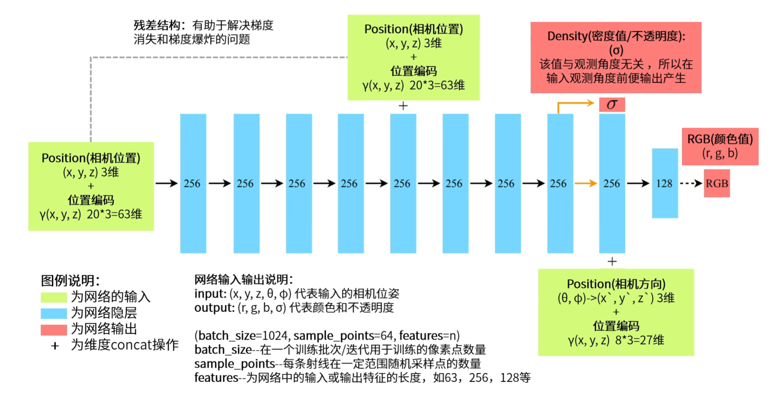 - 跳跃连接:位置编码后的输入会与网络中间层(第5层)相连,作为跳跃连接(skip connection),帮助网络在深层结构中保持空间信息的细节。