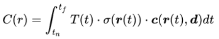 这个式子积分里面是T(t) 、密度 σ(r(t))和颜色c(r(t),d)的乘积,其中T(t)是累积透光率,表示光线射到这“还剩多少光”。实际渲染过程是把射线平均分成N个小区间,每个区间随机采样一个点,对采样得到的点的颜色进行某种加权求和。