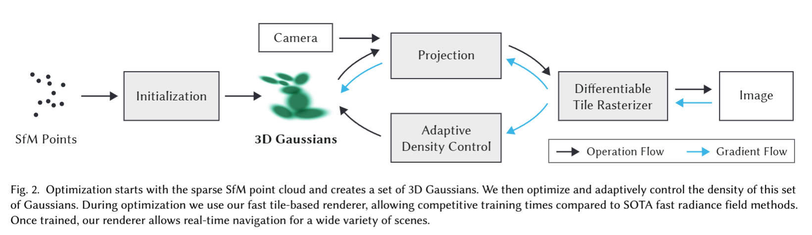- 优化:通过计算图像与目标图像之间的损失,反向传播梯度(Gradient Flow)来调整高斯参数。以及自适应地调整高斯分布的密度。