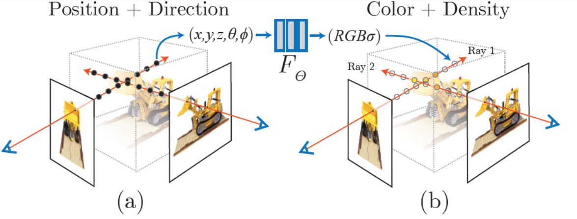 - NeRF使用类似光线追踪的方式创建新视角的图像。输入是采样点和观测的方向,输出是对应的RGB值和不透明度。