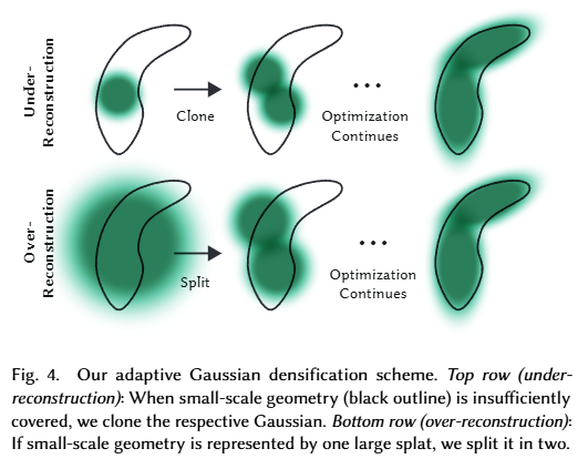 - Under-Reconstruction: 复制一个当前高斯分布的副本,然后沿着位置梯度方向移动它。